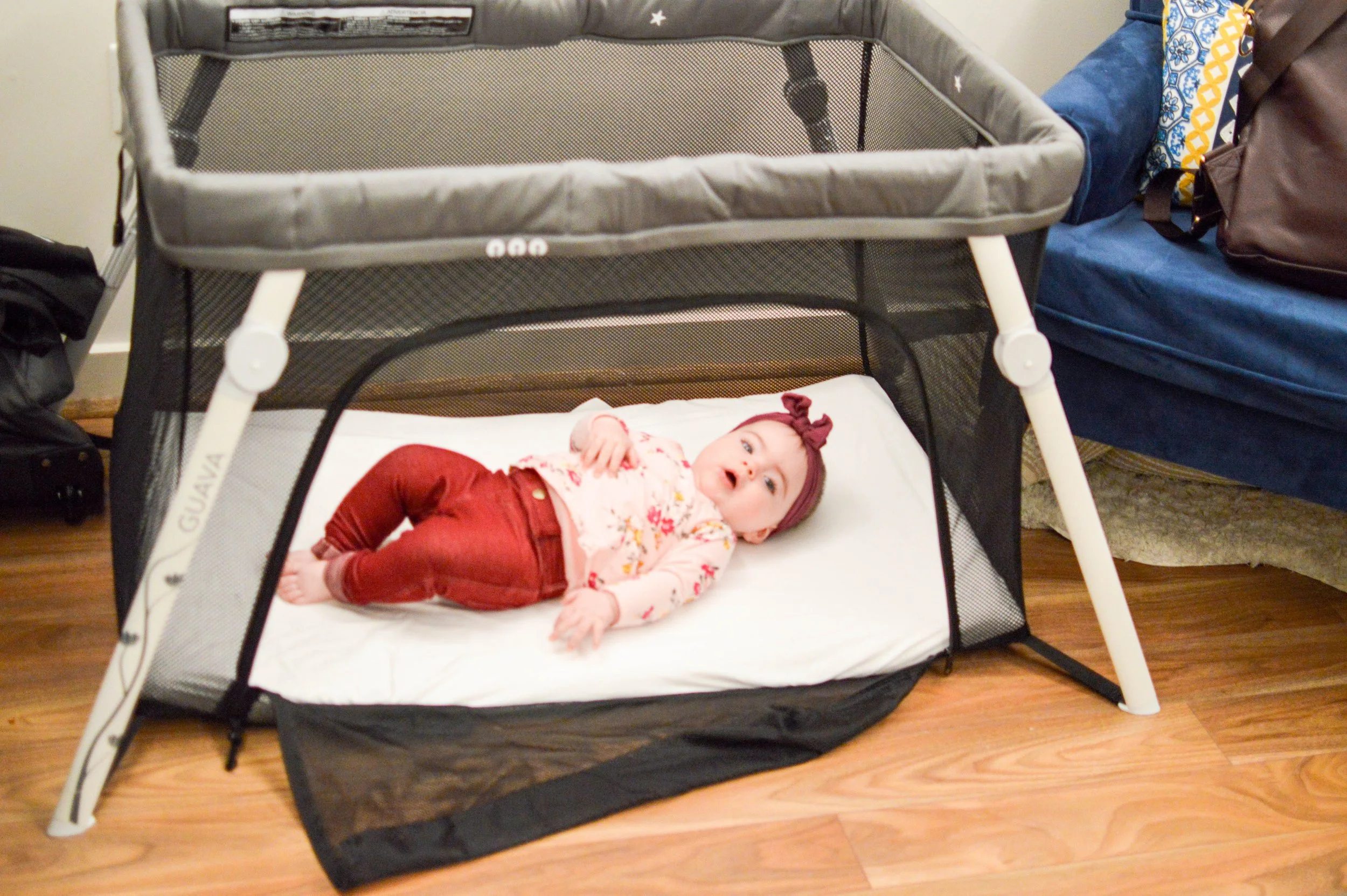 We love the Guava Family Lotus travel crib. This crib is so great for travel because its nice and light and folds up into a backpack for easy transport. The material is breathable and there is convenient access from above and unzipped on the side. It’s a great playpen too!