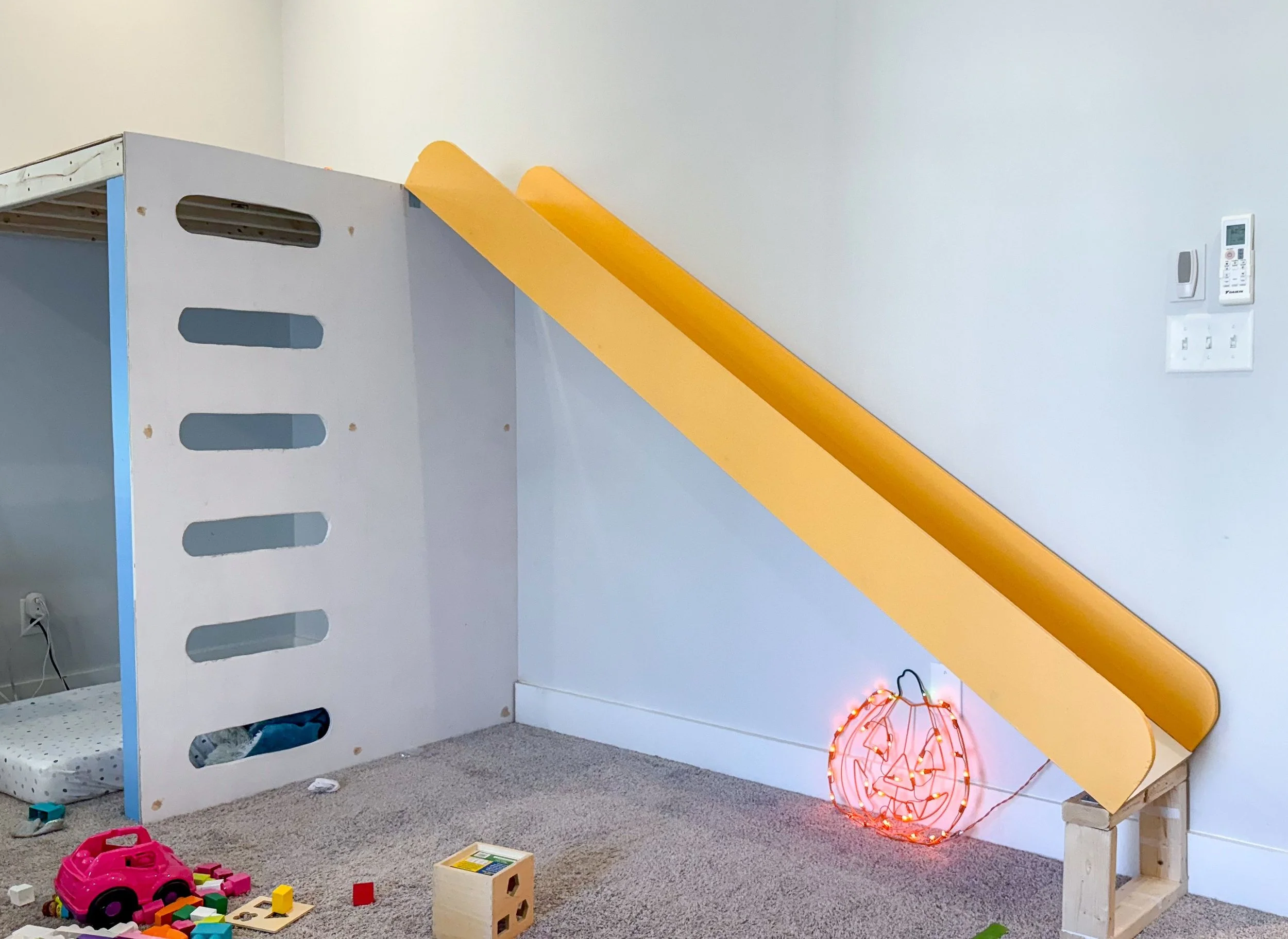 I'm still hard at work on my son’s room makeover. Today’s task is building a melamine and wood slide. I couldn't find any tutorials that were exactly what I wanted so I took pieces of different ideas and started dreaming up what I wanted from scratch. Being able to get creative with planning and giving myself the challenge is one of my favorite things to do! You've probably seen a fair amount of slides people are adding to their playrooms. They are getting pretty popular but the plastic slides are SO expensive. I did a little digging and found a couple of people who had made wood and melamine slides but they didn't give a step by step tutorial. So, once I figured it out for myself, I knew I wanted to share it so you can make one, too!