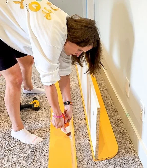 I used two coats of primer, like I always do, and then two coats of Honey Bell by Benjamin Moore paint. The 2 layers of both paint and primer really do help with the longevity of my painted projects. The color is pretty bright, but it works with the entire color scheme I have for this bright and playful room. Once the paint was dry, I took the boards upstairs to my son's room where the melamine already was. Melamine is already pretty heavy, so I knew it would be pretty unmanageable to take it up 3 flights of stairs if I were to assemble it downstairs. I used my drill to make some pilot holes through the boards and into the melamine along the groove I previously made. Then I secured 2 inch screws into the pilot holes. I repeated this process up and down both sides of the melamine which secured the side rails to the melamine, creating the slide.