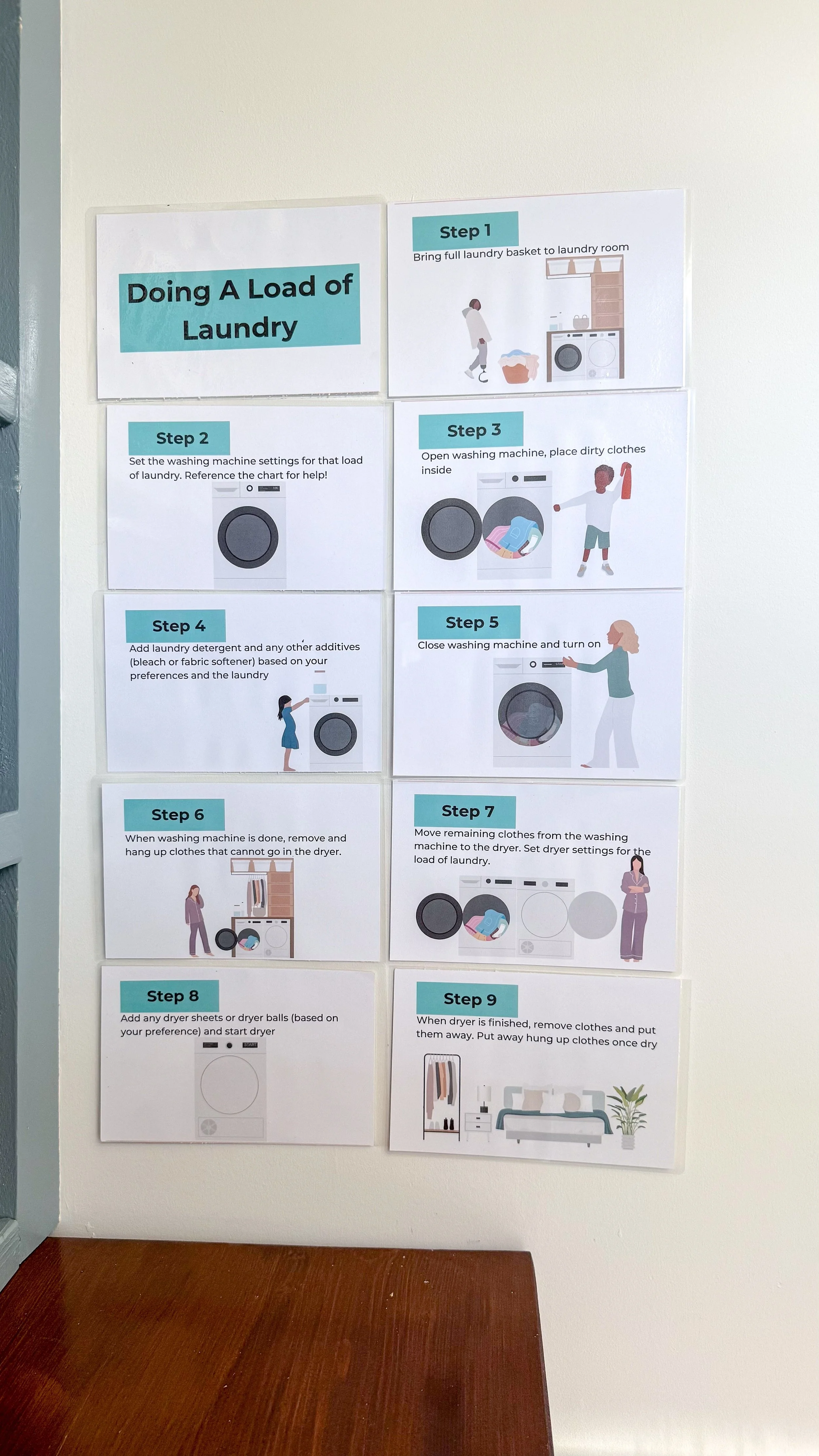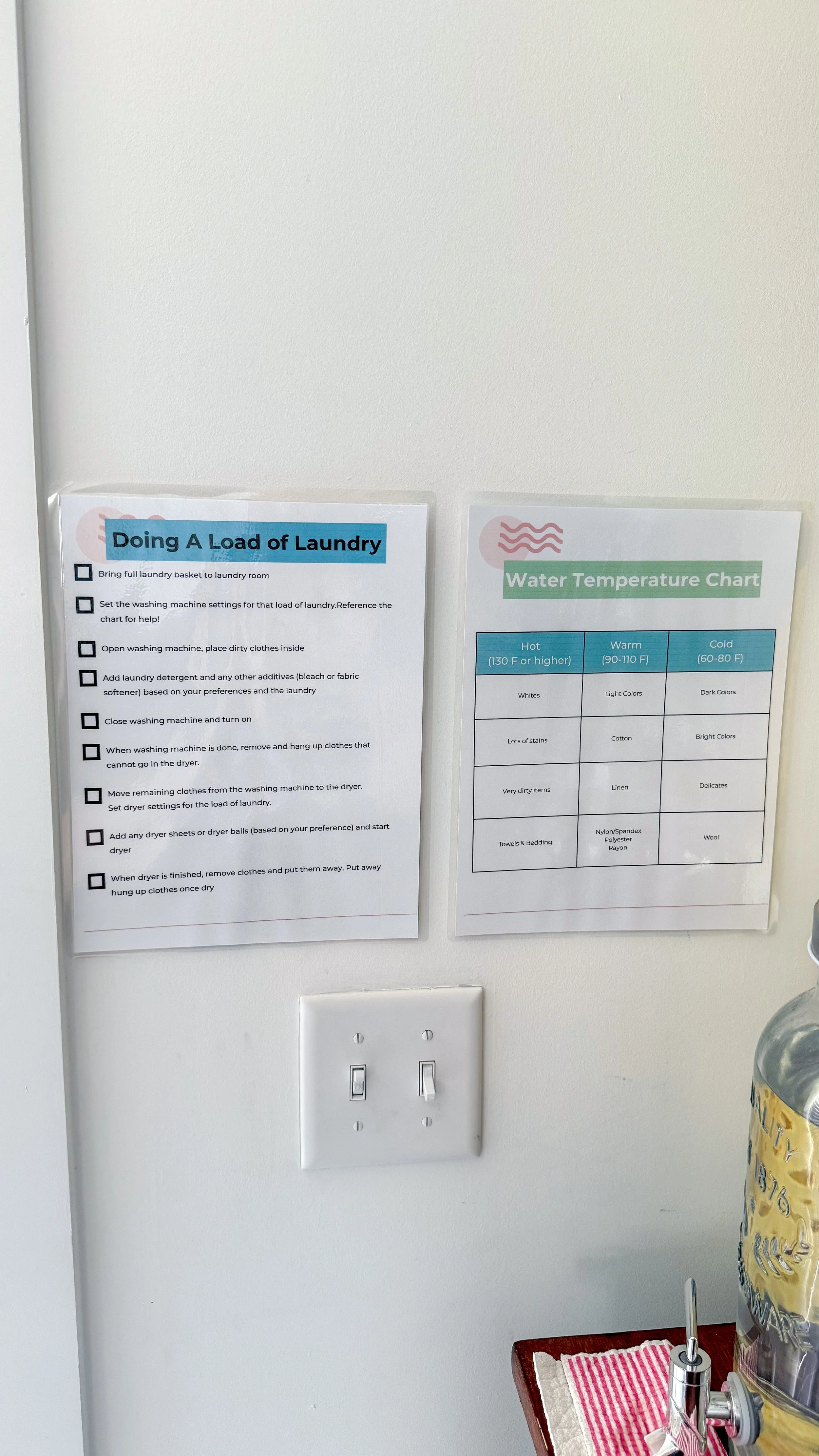 Before we got started, I put both the visual steps and the checklist on the wall in the laundry room so she can reference both. She's been leaning more towards checklists lately, but since it's laundry and it's a little bit more complicated, I am definitely going to have both. I suggest laminating these to make them more durable, but its not a necessity. I did the checklist along with the water temperature chart on one side of the laundry room, and then I put the visual steps on the other side of the laundry room. You don't need a ton of space for these and you can easily decide the placement. I like to put stuff a little bit higher because my daughter is tall, but also to prevent my 2-year-old from pulling them off the walls like he loves to do.