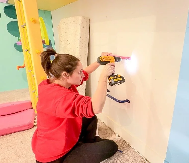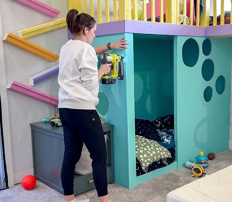 When I was deciding how I was going to cover up the obvious places needing trim, I also had to decide what color I wanted the trim to be. Trim can make a big impact depending on its color. If it’s the same color, it blends in, white trim makes things look clean and neat and colored trim adds a bold statement to a space. I used 1X5 boards and decided since the colors in the build changed a lot, I wanted to do the trim a contrasting color separate from everything else. Originally, the purple I used for the trim was going to be a set of shelves. However, those shelves didn't end up going where I originally planned. I'm still debating on if I'm going to add trim on the climbing ladder or slide wall but either way I can add it when I remove the slide and add shelves underneath it in the future. I'm not quite sure how the trim will work with the handles.