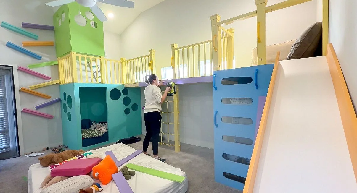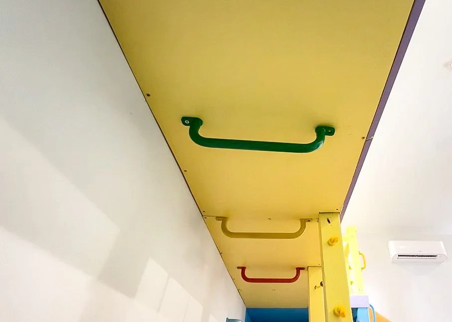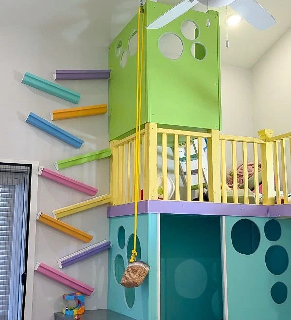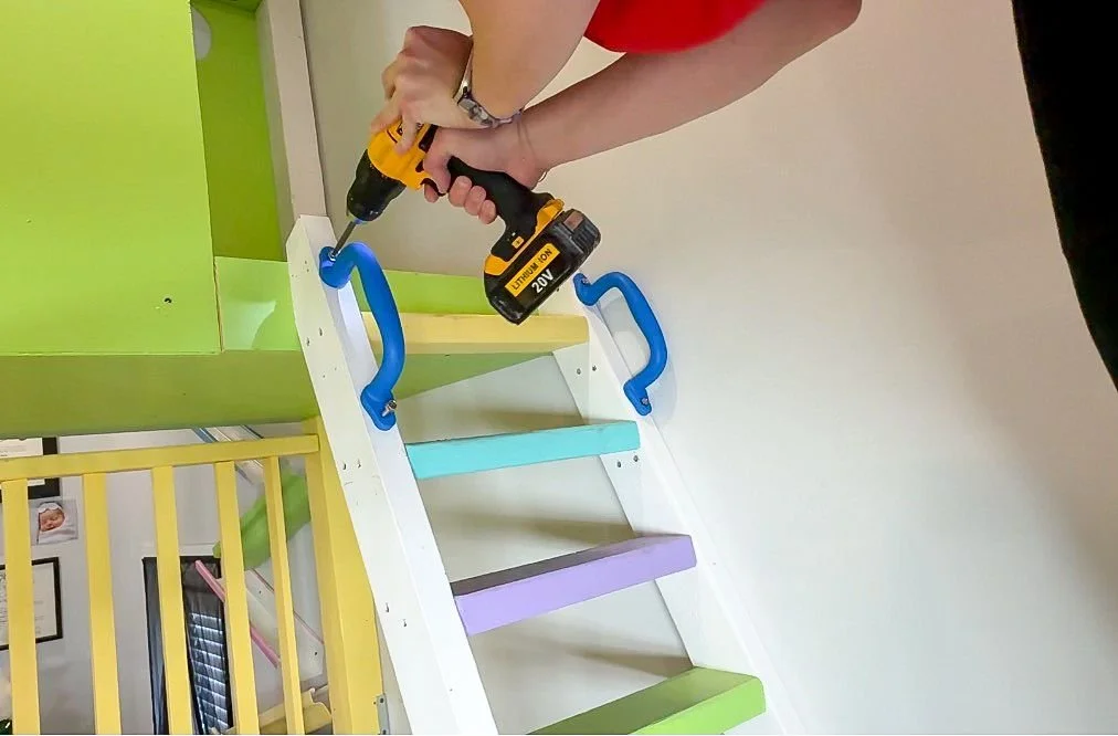 I found a pack of monkey bars I loved that came in six different colors, but had wait for them which pushed my timeline back a bit. I added three on the wall so my kids could climb up them to then reach the ones underneath the bridge. My daughter can reach them no problem, my son is still a little too small but I'm sure he'll figure it out soon. I also added little handles to the climbing ladder between the platform and the loft area above the bed.