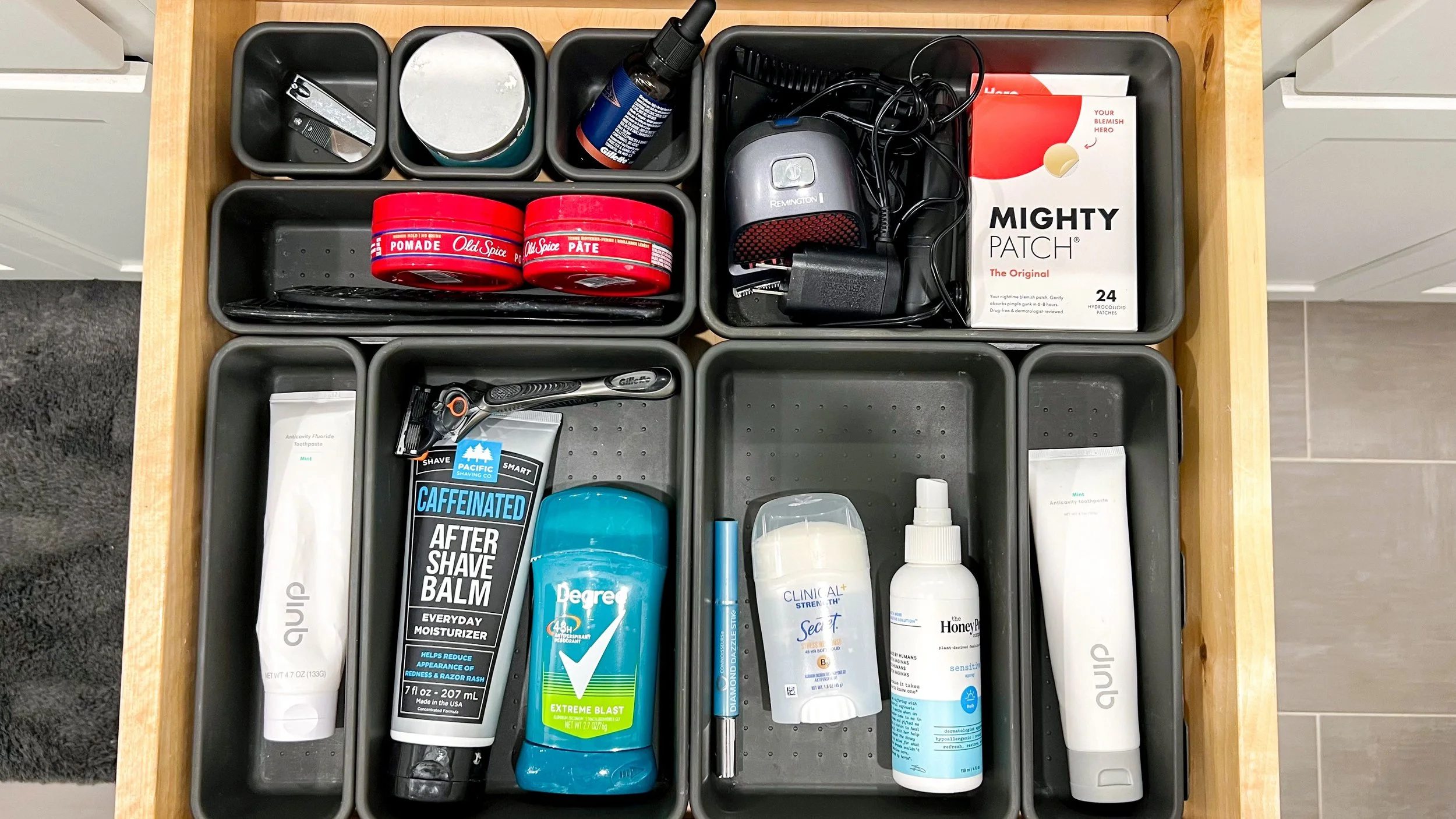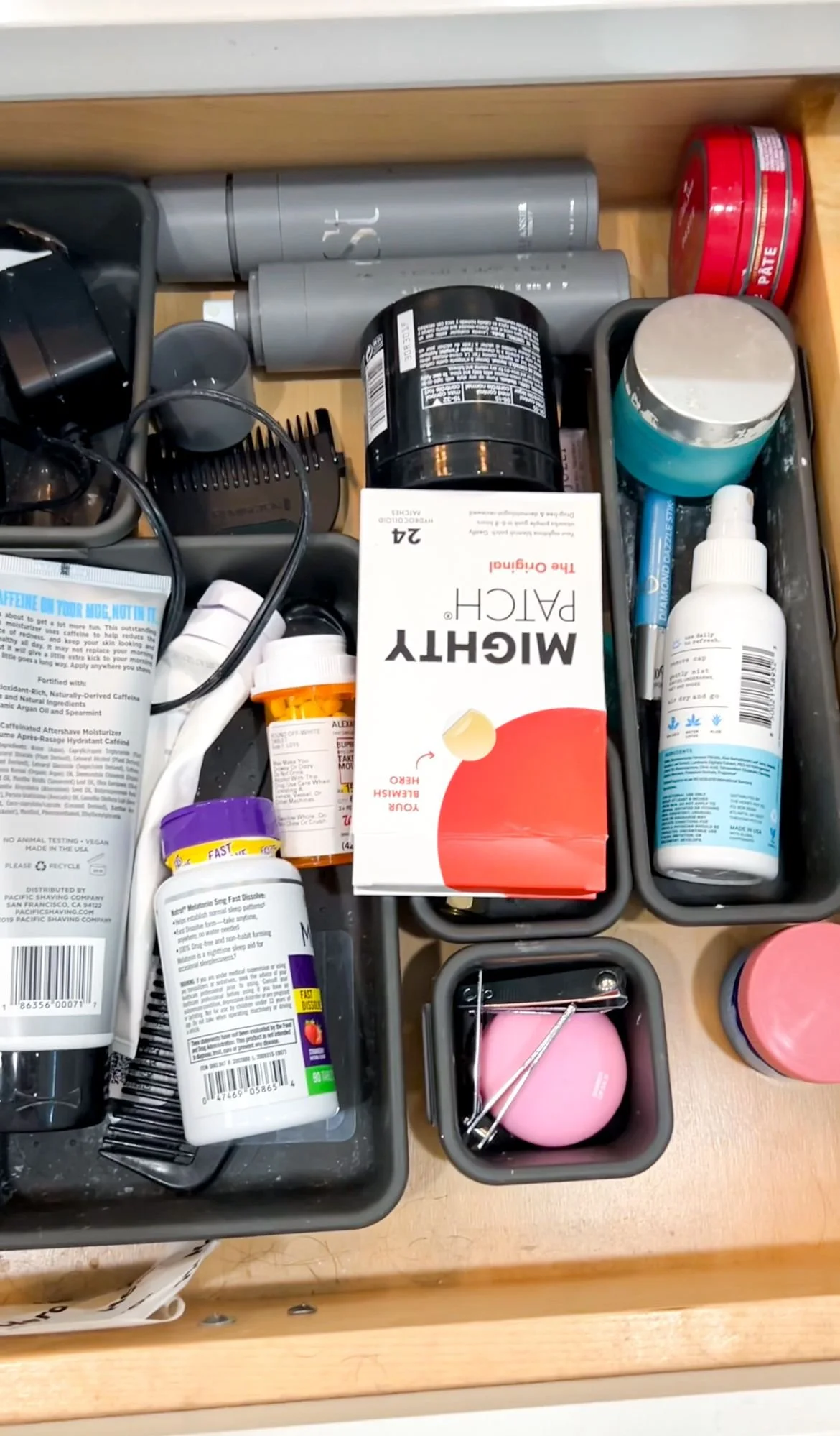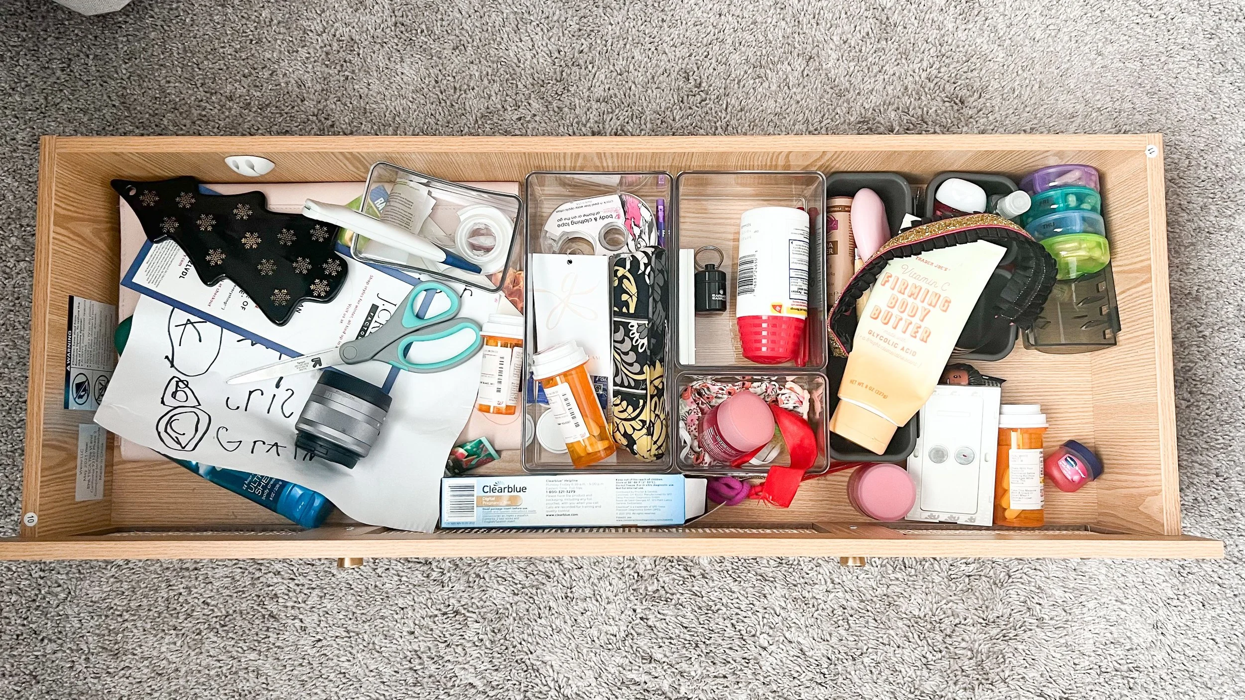 My next tip is to get containers to utilize and maximize the space that you have. I know it's really easy to get hung up on having matching containers so that everything looks perfect. When I organized my nightstand drawers, I did not use all matching drawer organizers. Some of them were clear, some of them were black, some of them were kind of opaque. They didn't all match, but they all used up as much space as possible in that drawer and I was able to utilize all of the space.