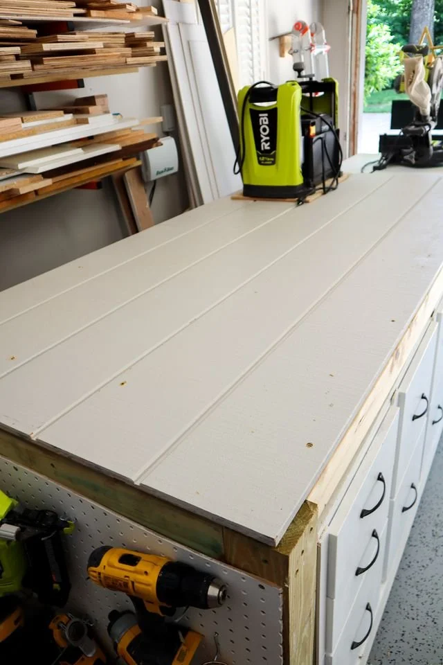 While I was hoping to get all of this done in one day, it had to be done over multiple days because I had to get a bunch of tile I had stored at my house and bring back to store inside of the stationary workbench. This was actually leftover tile from when my mom redid one of her bathrooms, but I kept it because the contractor was going to throw the tile away and I have a plan for it in my bathroom at my house. I needed a better place for it for the next six months and I was able to find a spot in the workbench. I put away all of my tools and little things that were scattered all over the place. Then it was time to tackle the top of the moving workbench.