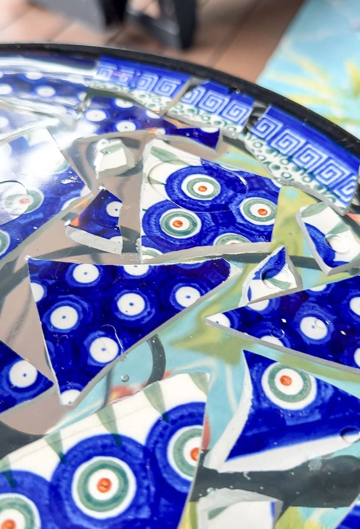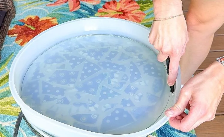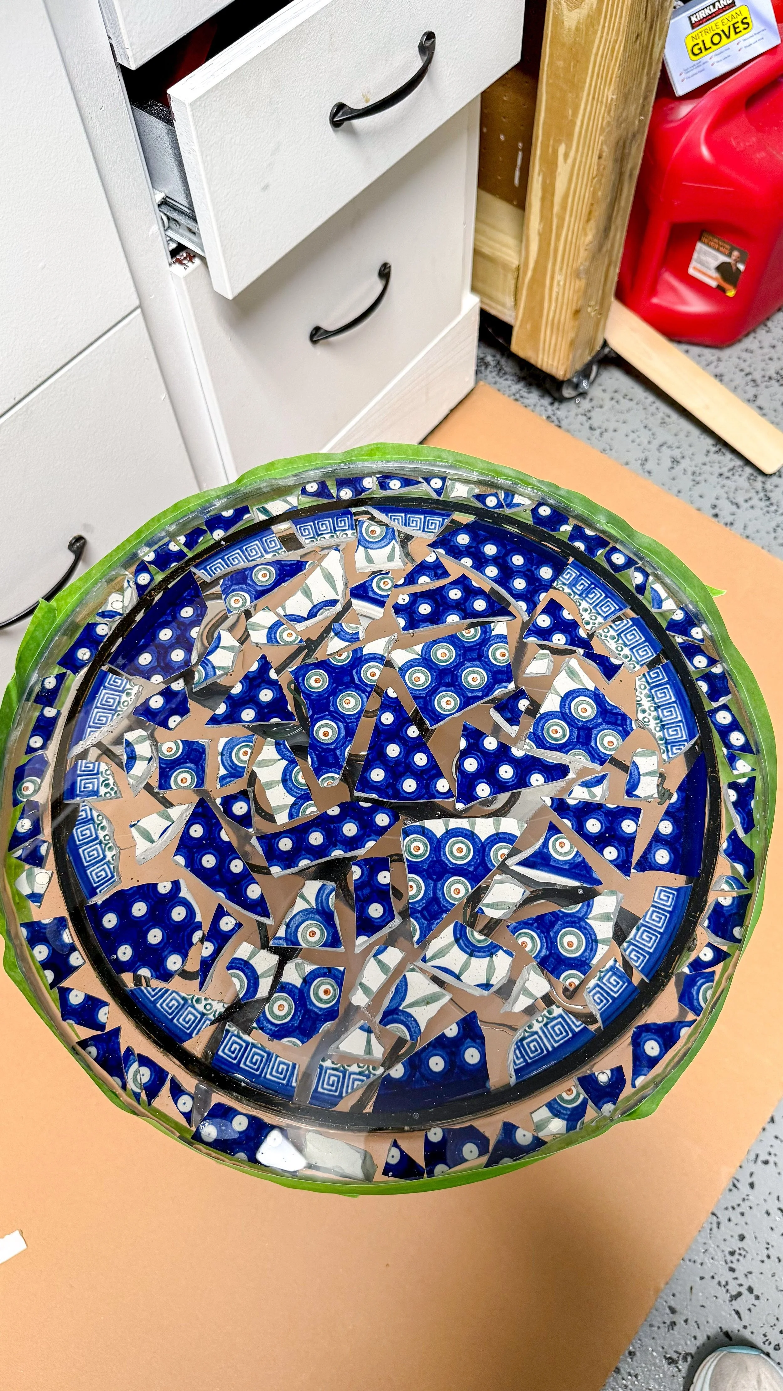 The first problem that arose with this table is that it's not solid. There's a design, with sides and a bottom with no top but there are tab pieces that I needed to remove that used to hold a piece of glass. Since glass isn't what we are dealing with, the tabs needed to go. I used my multitool and sawed the tabs and then started on the first pour. I put the table inside of a silicone mold a little bit bigger than the diameter of the table. My mom put each polish pottery piece inside of the mold, so they were kind of floating and then I poured the epoxy.