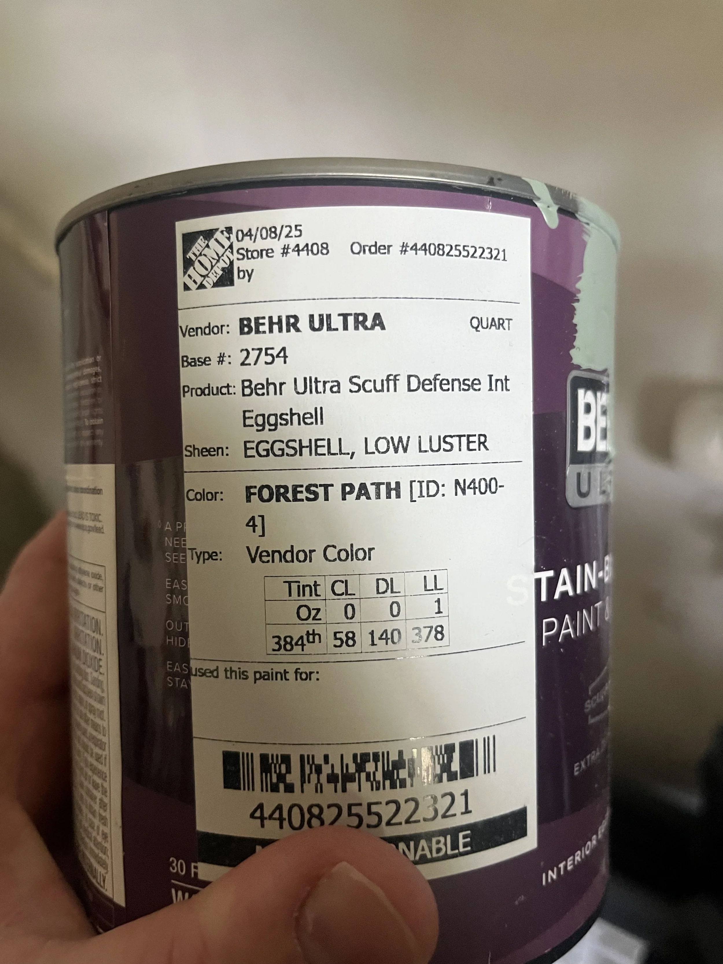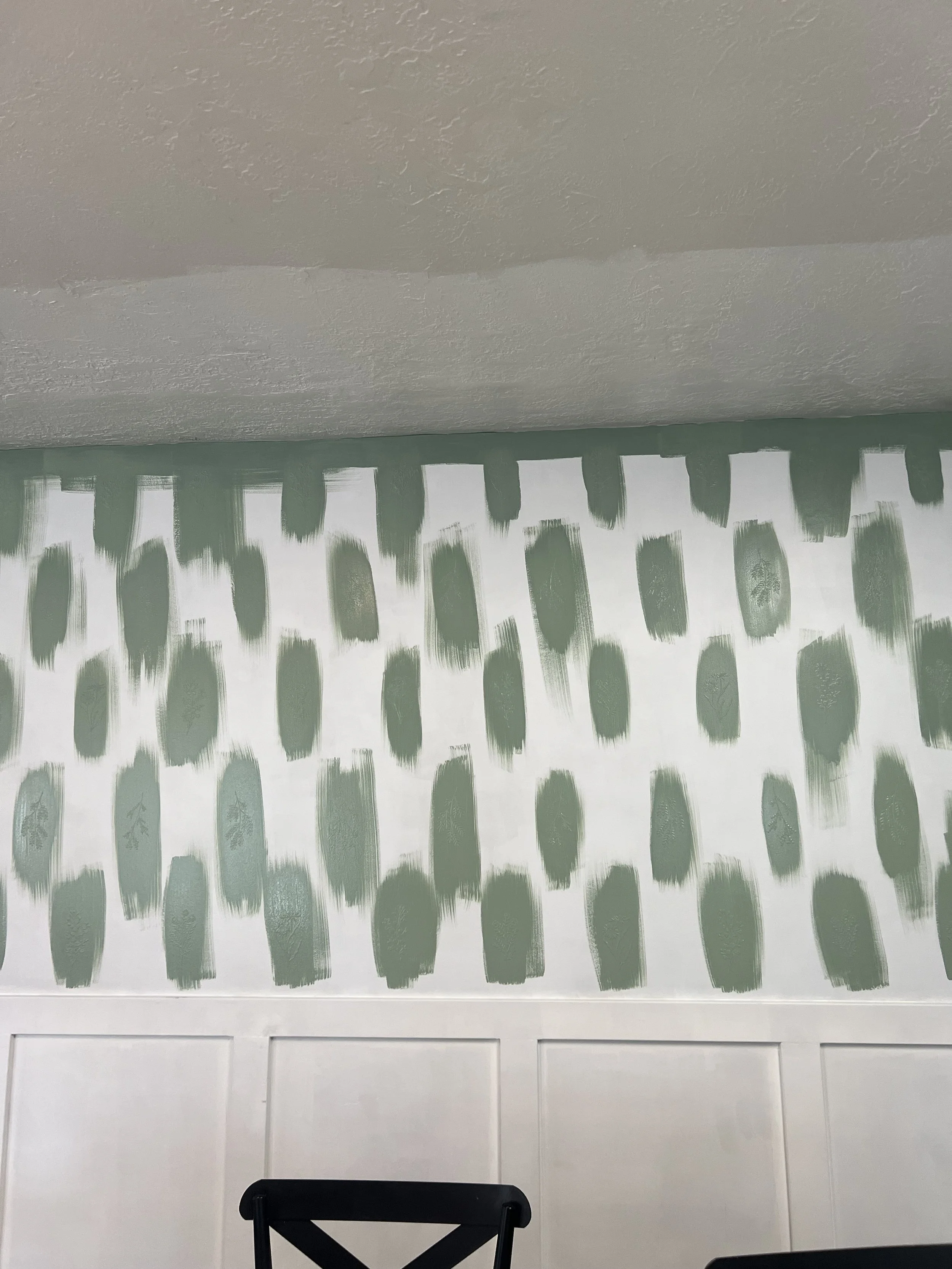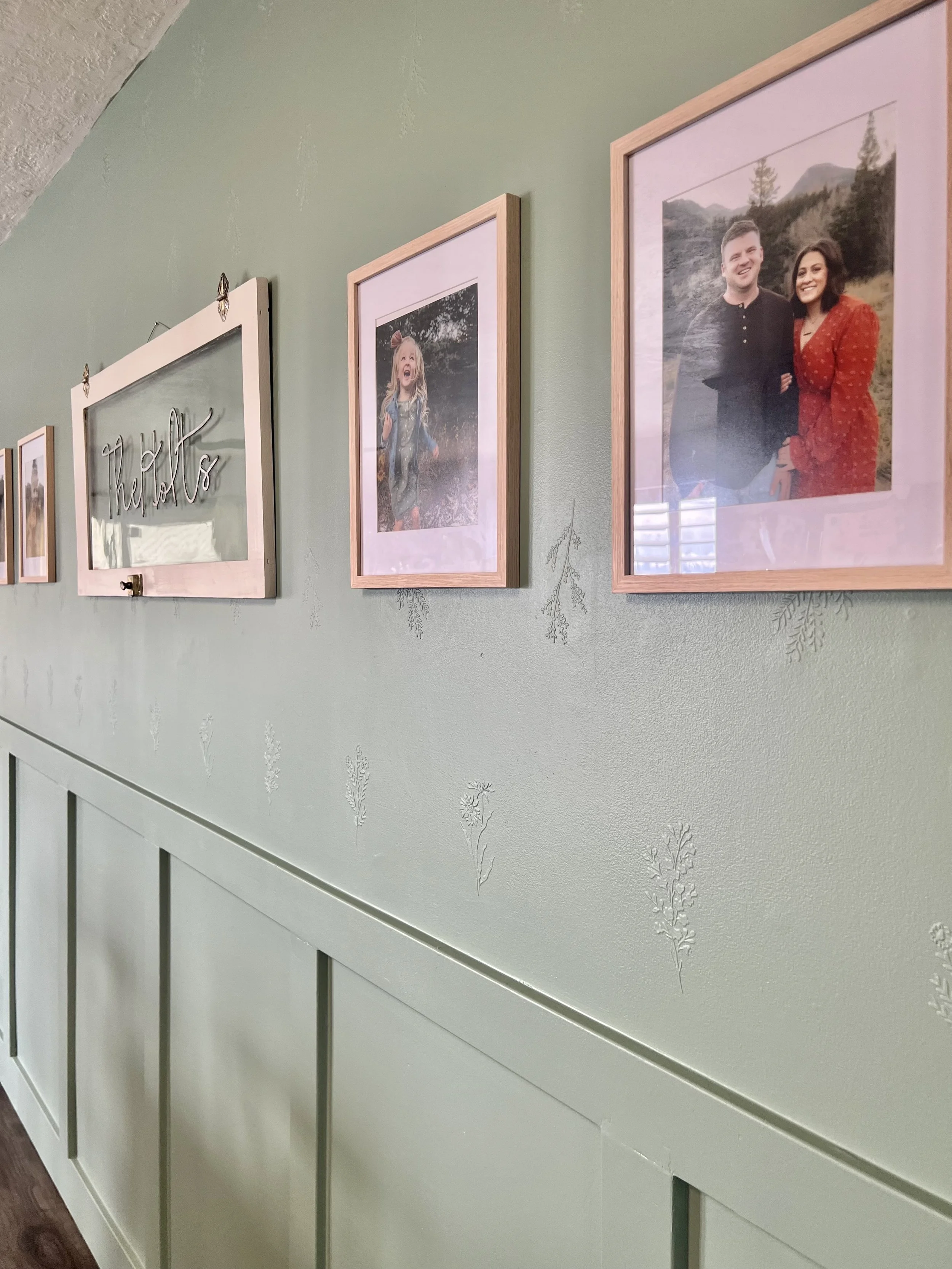 I used Behr Ultra Scuff Defense in Forest Path to paint the whole wall. This sage green has been my favorite color for as long as I can remember. It was even my only wedding color with just some accents of cream and gold. At the time (this was almost 10 years ago), it was so hard to find anything sage green. So hard, in fact, that I had to search high and low and DIY almost everything for the wedding! For this project, I originally got it in a satin finish, which turned out to be a problem because you could barely see the stenciling. I was really frustrated because I wanted the florals to actually stand out. After consulting with Emily, we realized the problem was probably because satin is a shinier finish which catches the light and takes away from the stencils. So I headed back to Home Depot and got the same paint in an eggshell finish.