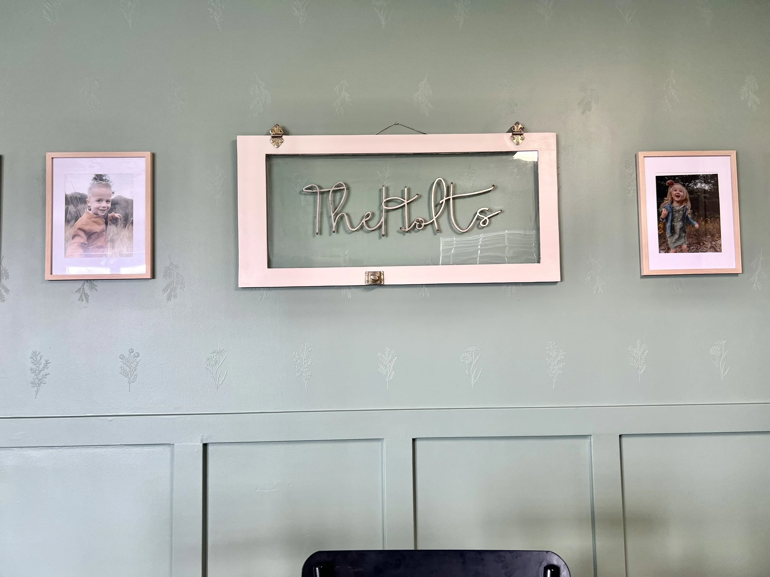 After painting the entire wall in the eggshell, I decided to go an extra step and combine the paint with a little bit of white paint to make a SLIGHTLY lighter shade that I painted onto only the flowers to make them stand out just a little more. Once everything was dry I was able to add some simple decor, including this vintage window pane I thrifted and painted cream.