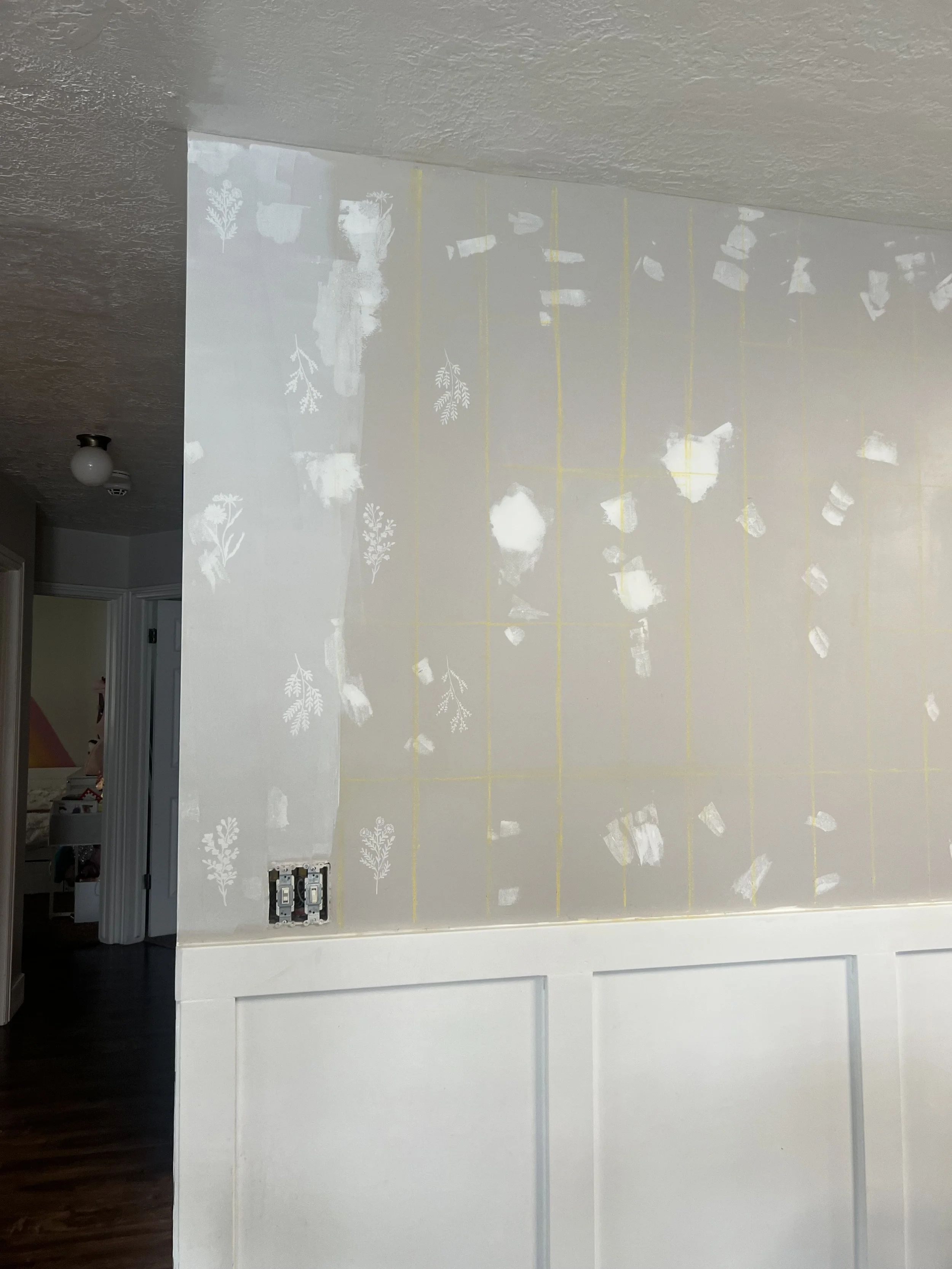 Hi friends! My name is Sydney. I'm the resident craft queen here on the Breezing Through team. I love anything crafty or creative that lets my artistic side shine and am an expert at over-ambitious party decor, accent walls and the regular ADHD hyper-focus. There is a wall in my kitchen I have been debating about doing something to for a while. It's a central focal point in our home, so I knew I wanted to do something special. There were a few things I knew I wanted on this wall. I was adamant about adding texture and depth and knew I wanted a bold color. I looked at different wall papers but wasn't happy with the price point. So, with no concrete plan in mind and a lot of unwarranted confidence, I grabbed some joint compound and some floral stencils and went to work.