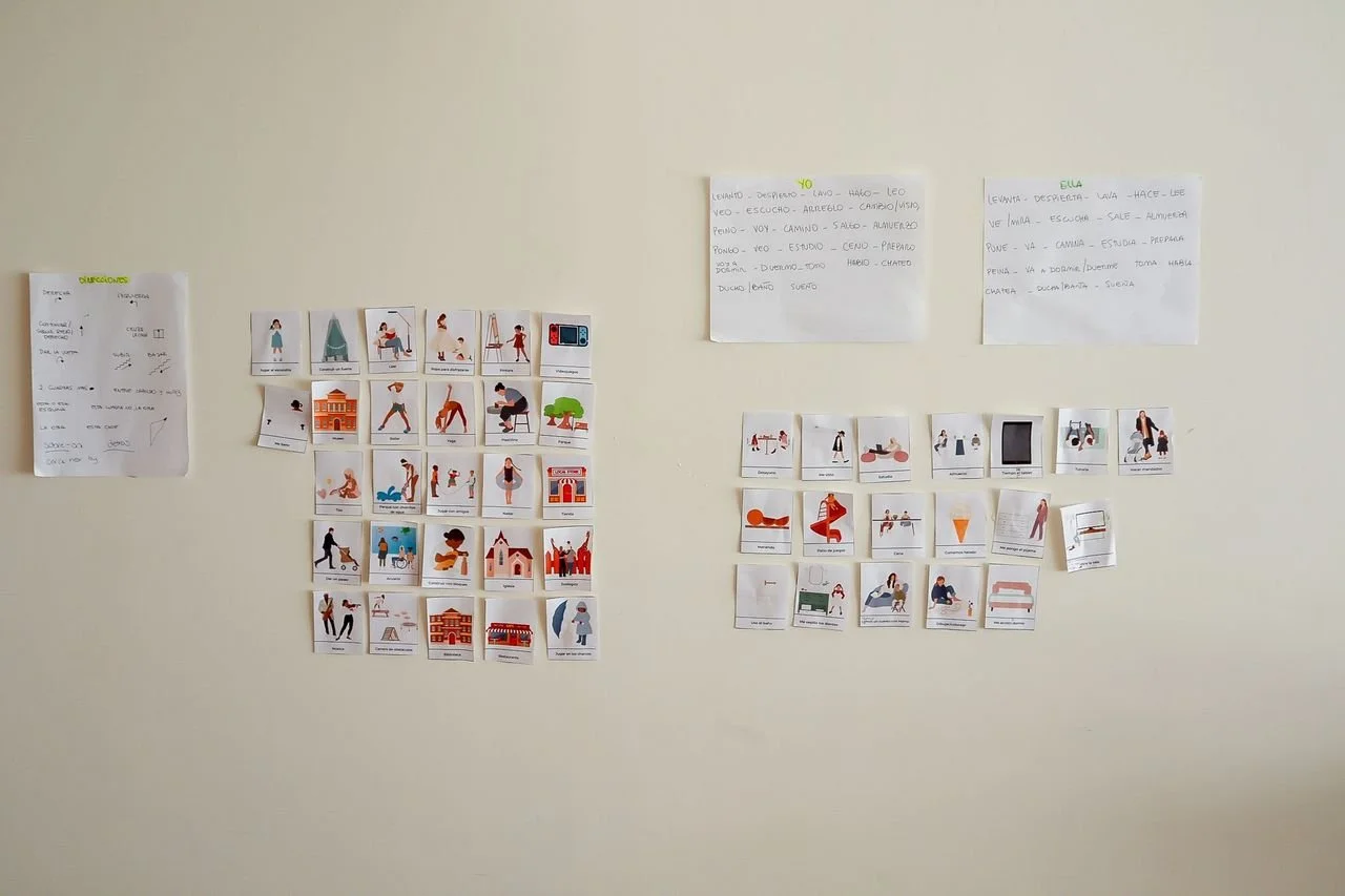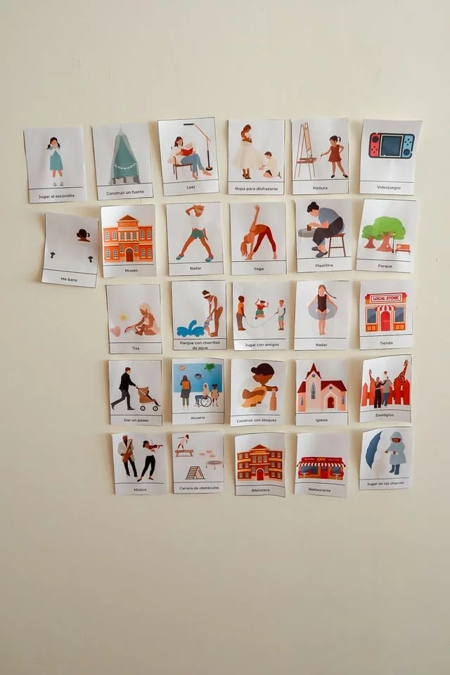 One of the things we've been working on with our Spanish tutor is daily routines and the verbiage that goes with it. We already know Jackie thrives with routines so we knew learning those routines in Spanish would be really helpful. When we started talking about routines, I knew the best way to help her would be to have a visual for her. I started taking images our tutor gave me like in a worksheet to help create a visual schedule board for her. Then I realized, duh, I have a visual schedule board! Not only do I have a visual schedule board, I have it already in Spanish. So I took the Spanish visual schedule board, tweaked it a little bit so we're using some Argentine specific phrases and words and printed it out. Jackie and I put it on the wall and then our Spanish tutor came over, corrected a few things and made some tweaks to make it Argentine specific. We've been able to use it daily! I'm going to show you how we did that and how you can do it too with the Spanish visual schedule board download.