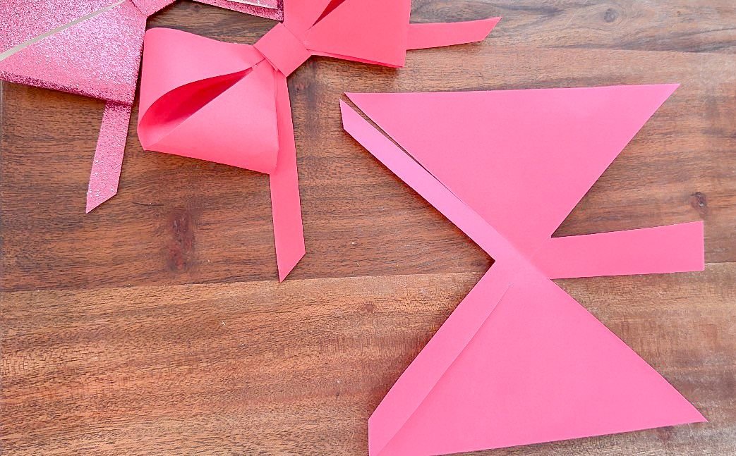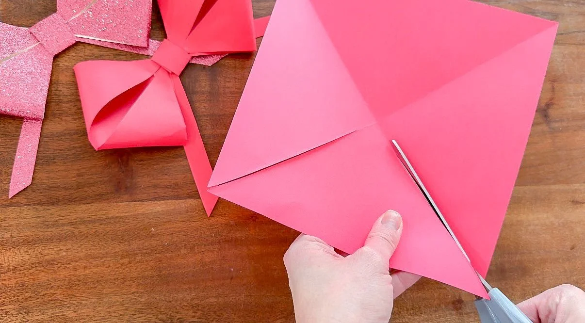 This bow garland has gotten a lot of hype online, so I wanted to show you how to make your own. First, gather your desired colors of 8x11 paper and fold them into squares, cutting off the excess using a paper cutter. Save these pieces because we can use them for our heart garland later! After trimming the paper I folded it on the opposite side so there were two intersecting creases in the paper.