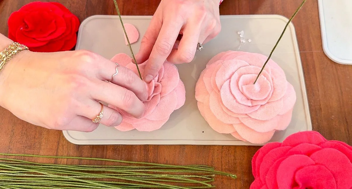 I got fairly thick floral wire and then used my fabric scissors to poke a hole in the flat round piece that I put on the back of each rose. Then, I used the hot glue gun to secure the floral wire to the back piece and let it sit to cool. While it was cooling, I took a few little scrap pieces of felt and cut them into half circles and put some hot glue on them and placed them around the wire where it goes into the bottom of the flower, just so it looks more put together and finished. Since the larger roses were heavier, I used the wire to wrap it around a thin dowel just to give it a little bit more stability. I like adding the wire to a dowel instead of using a dowel on its own because it adds a lot more lifelike movement to the flower.