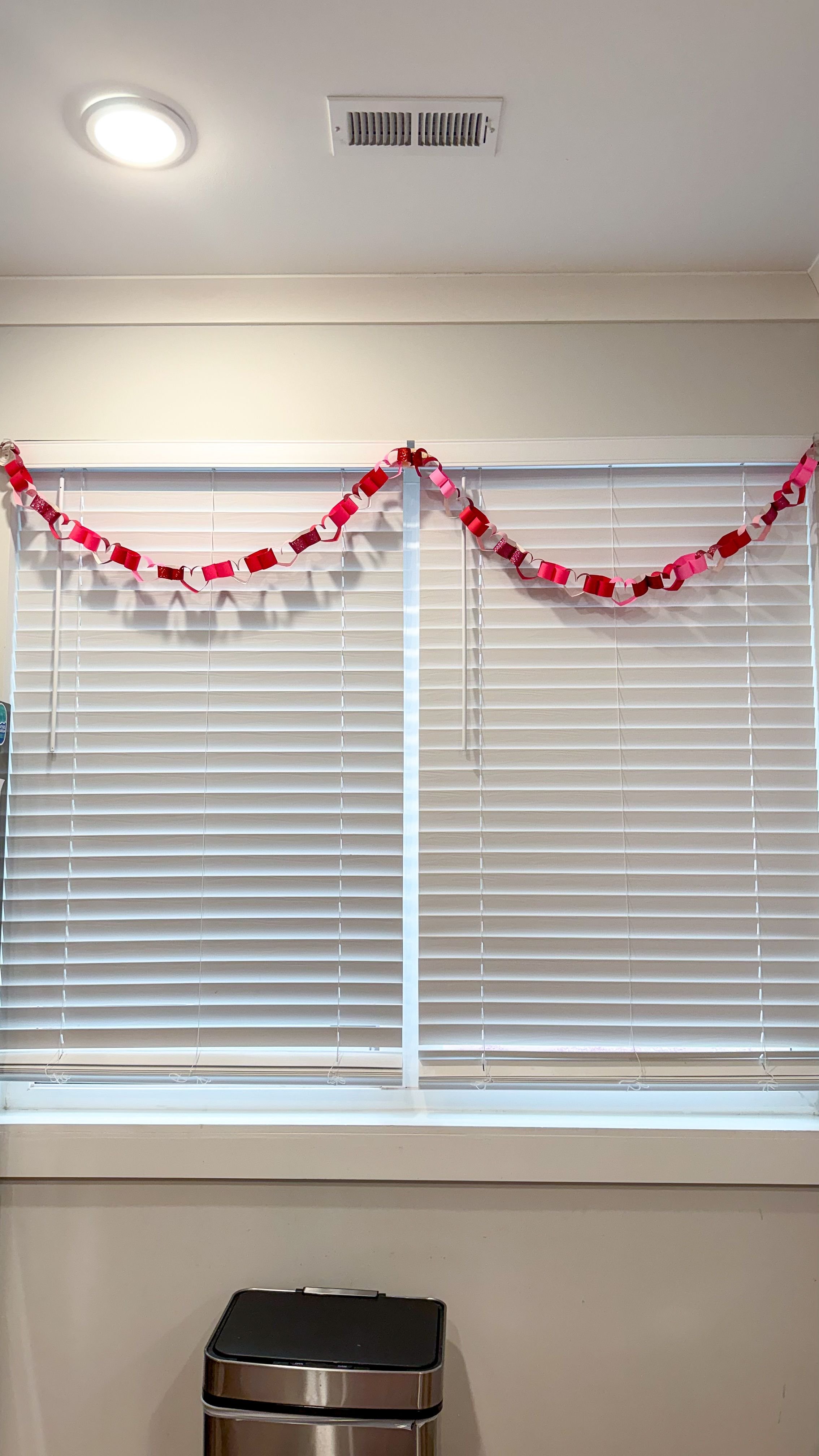 I made two different sizes of the heart chains. The first one I made you can actually see the glitter in it because it was the leftover paper from a different project. They were originally from an 8x11 piece of paper, so I just cut them into thirds, making the strips 8.5 inches each. I also did a version of the paper chain with bigger hearts. With this one I cut the card stock that I was using lengthwise making the strips 11 inches long. Now that I've made them in two different sizes, I want to make so many more and put them all over our house, which is totally unnecessary, but considering how easy they are and how cute they look I am definitely considering it!