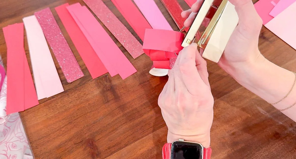 This viral paper heart chain couldn't be easier! All you have to do is cut your paper into strips and fold each strip in half so you get a nice crease at the bottom which will be the bottom of your heart. Then you take the two top pieces of your strip and fold them into each other. I used a stapler to secure them, or I've seen people use glue. Honestly, a stapler is going to be the easiest with the least amount of mess.