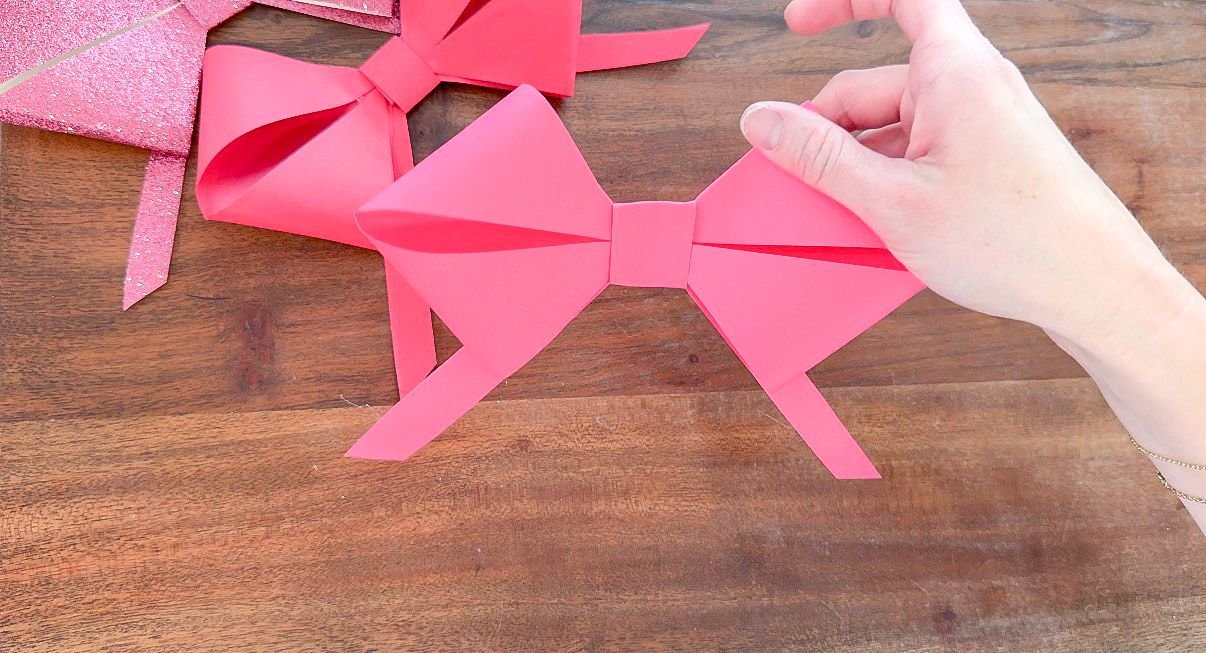 From there, I took the two diagonal pieces and flipped them backwards, so they went behind the bow. Then I took the longer straight piece and wrapped it around the center to make the finishing touch on the bow. I also added a bit of glue on the back to secure it into place. I've seen people doing this and using just plain colored card stock, but I wanted to experiment a little bit and see what would happen if I used glitter card stock as well. I noticed that the glitter card stock is a lot more likely to crease and crack in random places that the regular card stock is, but it wasn't hard to cover that up when I put it together into a garland. You technically can use a glue stick for this, but I found a glue gun to be a lot more effective at holding the card stock paper in place.