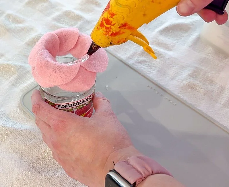 We've also been doing a small flower arrangement for my daughter's room, and we found a really pretty sparkly fabric. It's not felt, it's like a faux leather almost. I decided to see if I could make a flower out of it similar to the roses. I drew all the circles I could on the sheet of fabric which ended up being 15. I did all the same steps with cutting them and gluing them around the rim of the jam jar. There ended up being a little gap before I put the round piece on the back to hold the whole thing together. I still needed some way to fill in the center of the flower because it was gonna look funny otherwise. So I took a little strip of scrap fabric, cut it in half and used hot glue to wrap one of the pieces of wire with that fabric. I then poked the wire through the center of the flower and hot glued that section into place. It turned out a little differently than the other flowers, but still is really pretty. I can't wait to experiment more with these types of flowers because I had so much fun!