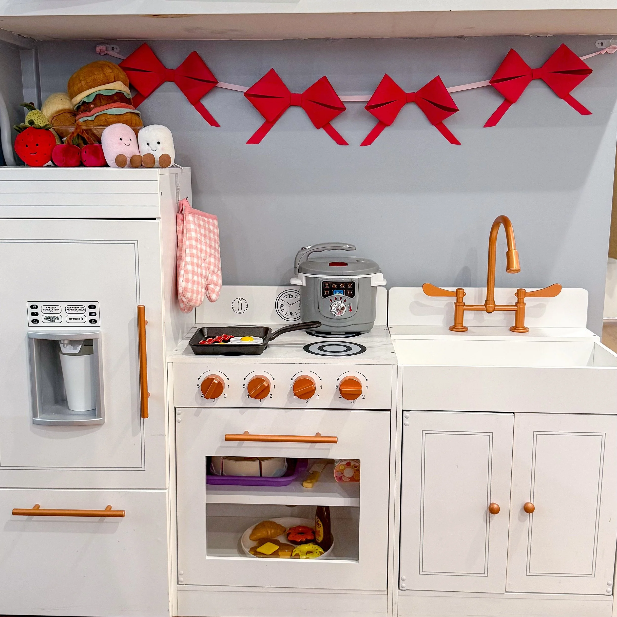 When assembling them into an actual garland, I used a ribbon to string through the backs of the bows and it held together really well. I made a smaller garland with four bows that went underneath our kitchen bar where the play kitchen is for the kids. Since they were strung through the ribbon I was able to spread them out nicely. I feel like for a smaller garland where you spread the bows out the ribbon method works great, especially if you want flexibility on where they are landing on the garland. However, if you are looking for a garland where they are all really close together I would suggest weaving the ribbon through the bows and adding hot glue to keep them in place.